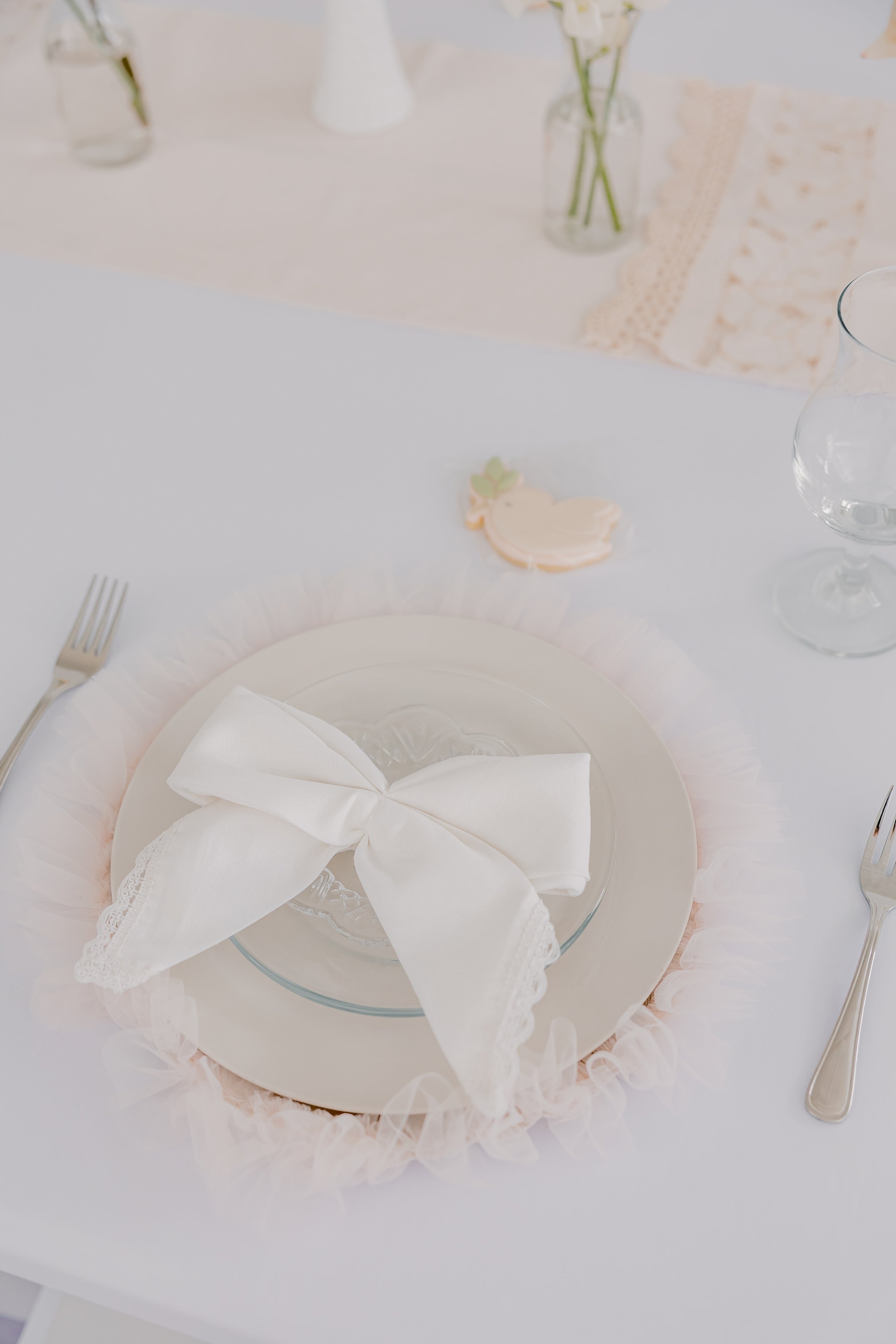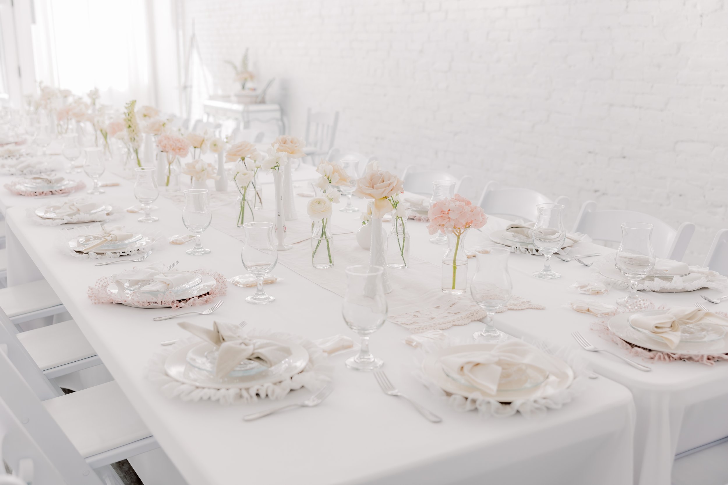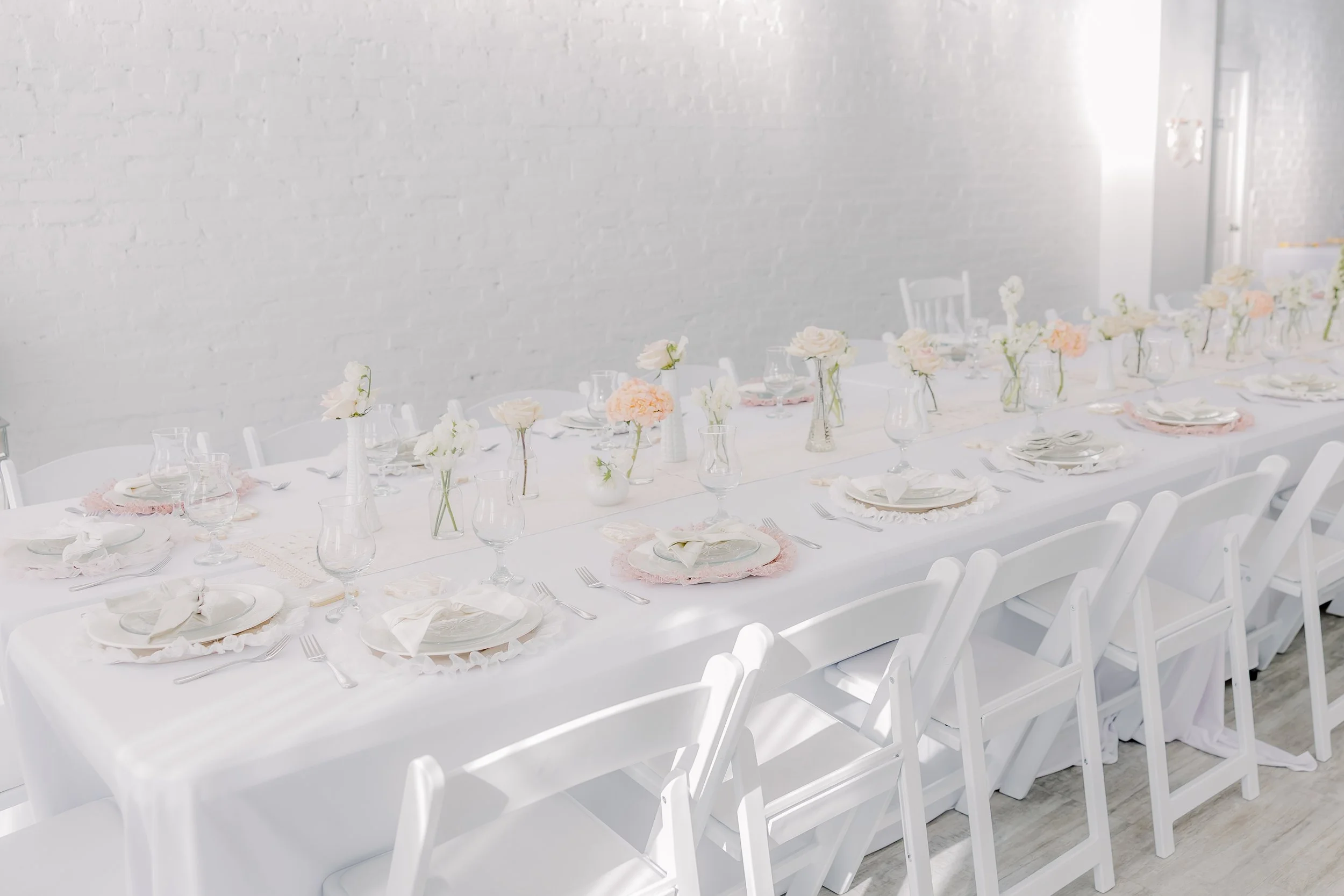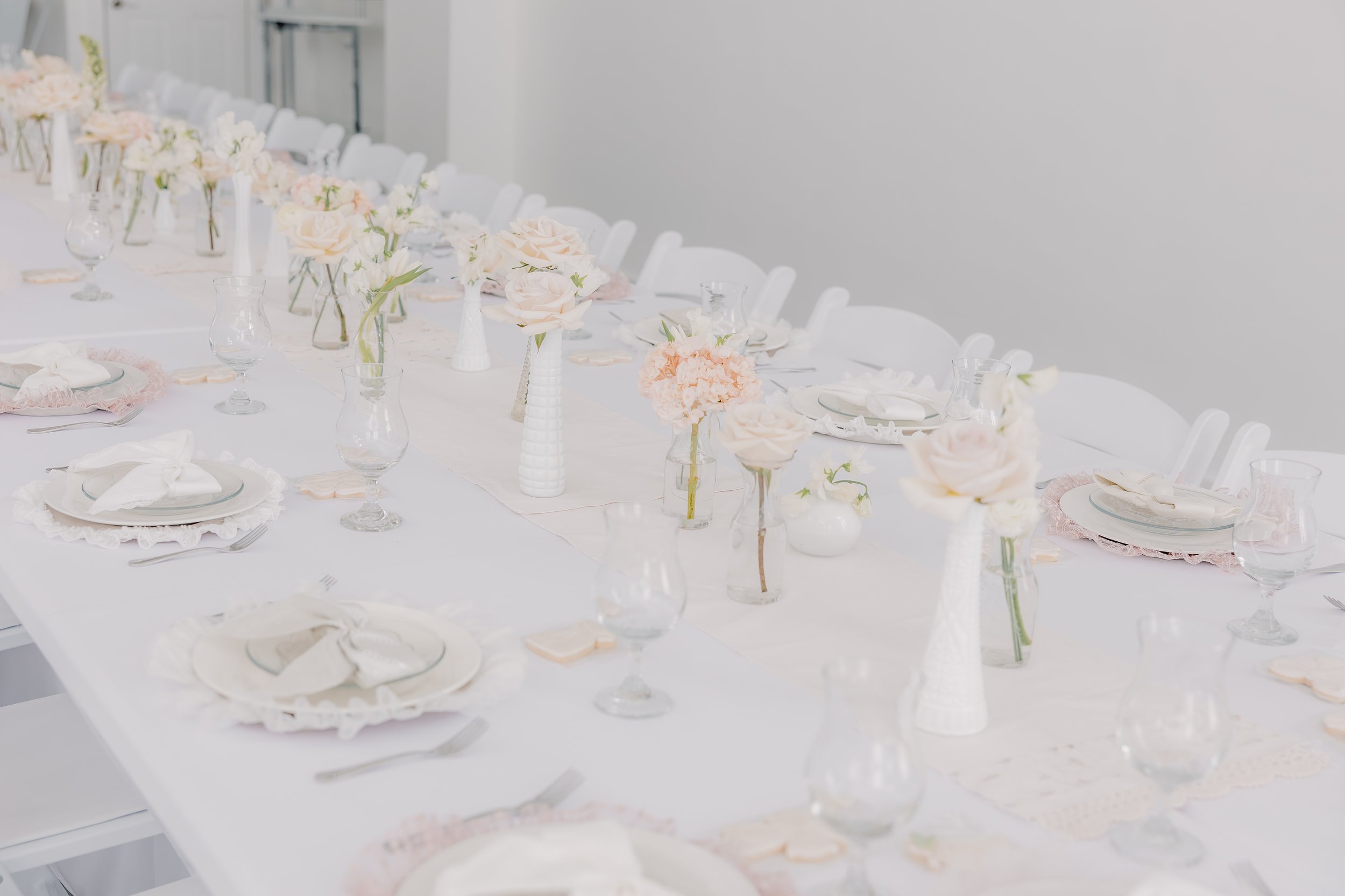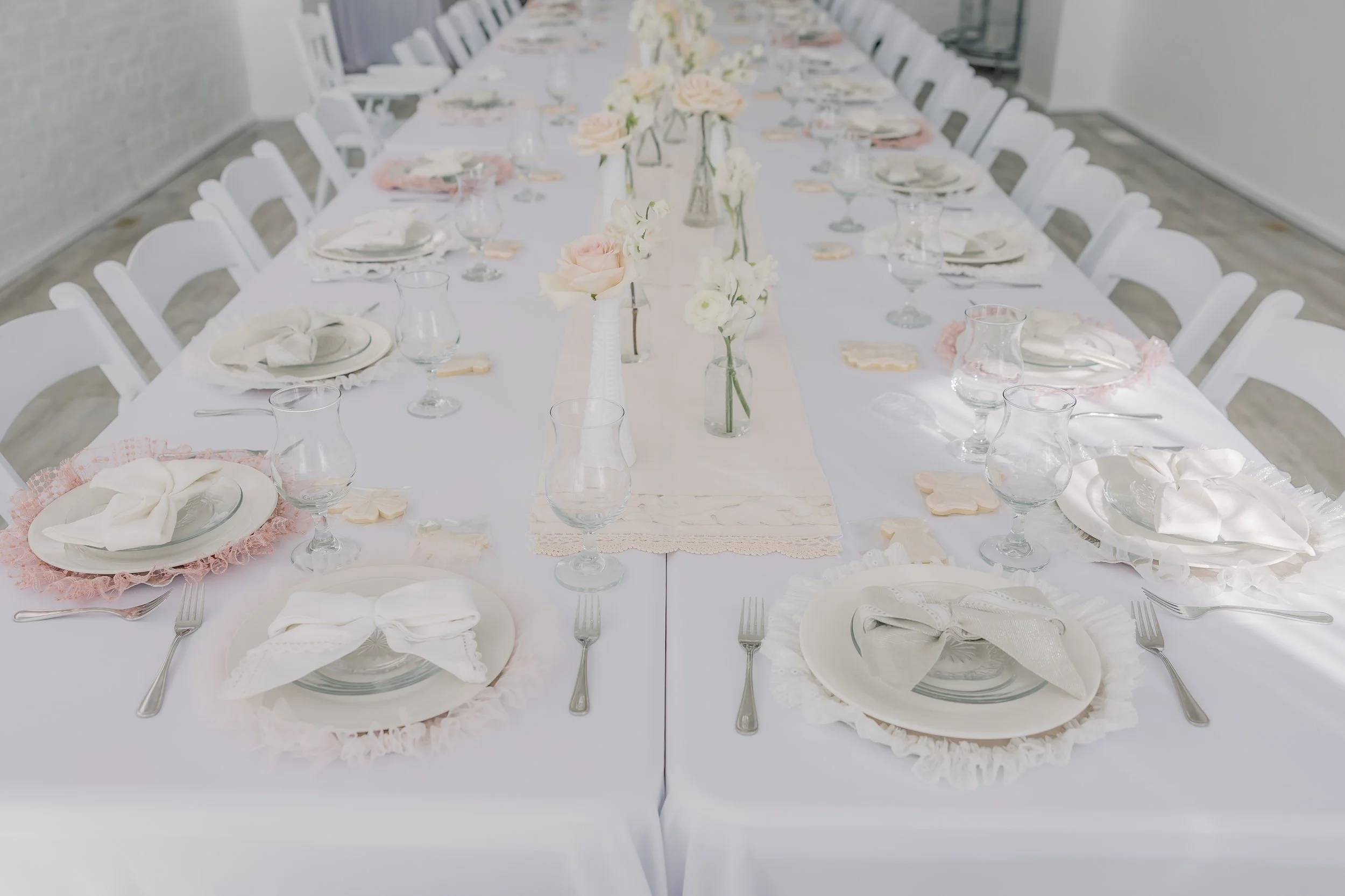 For this “Little Blessing Brunch” theme designed to celebrate a little one’s baptism, our designers used hand-sewn place setting mats made especially for this event, vintage linens and milk glass vases sourced by the team, and a long table filled with fresh florals to create a look that felt sweet, simple, and special.