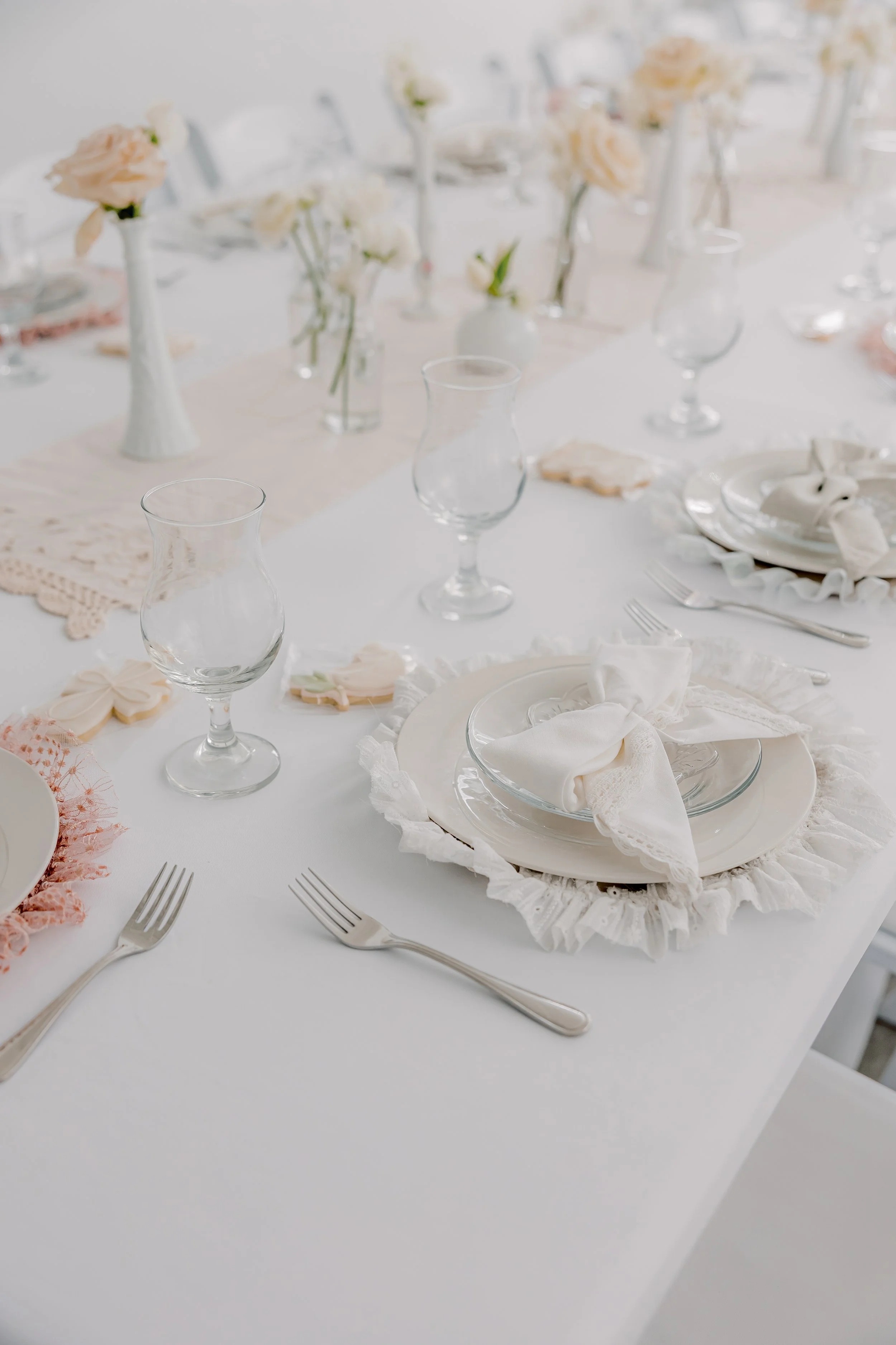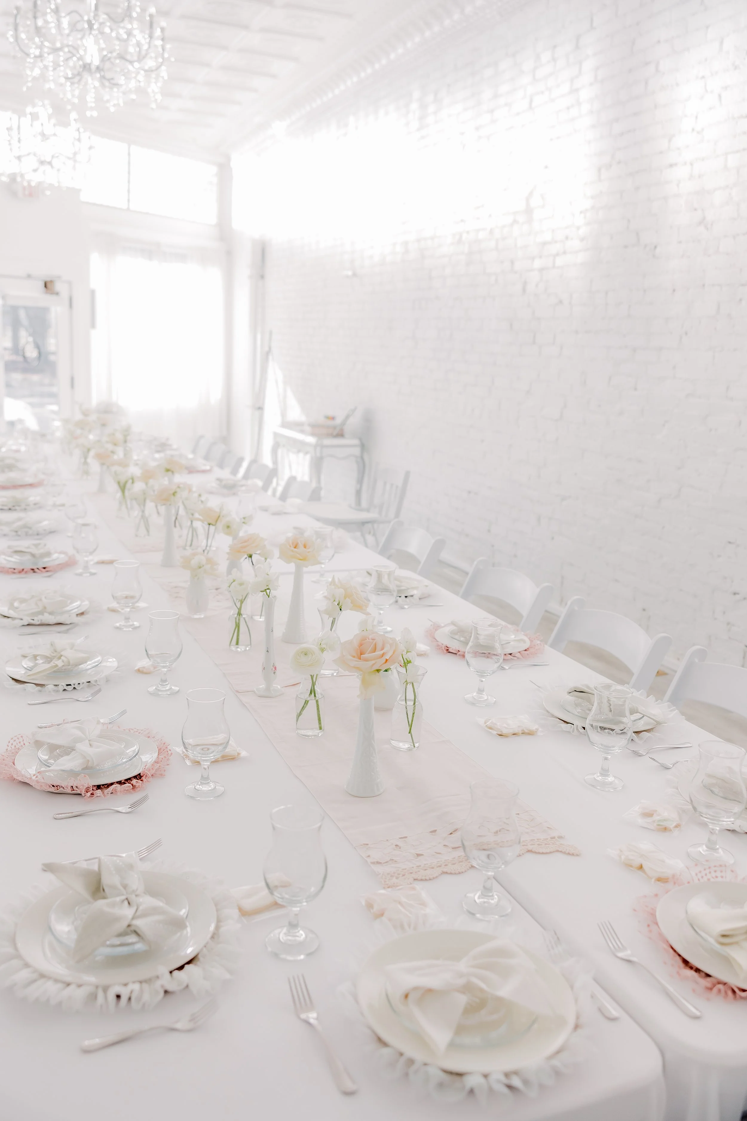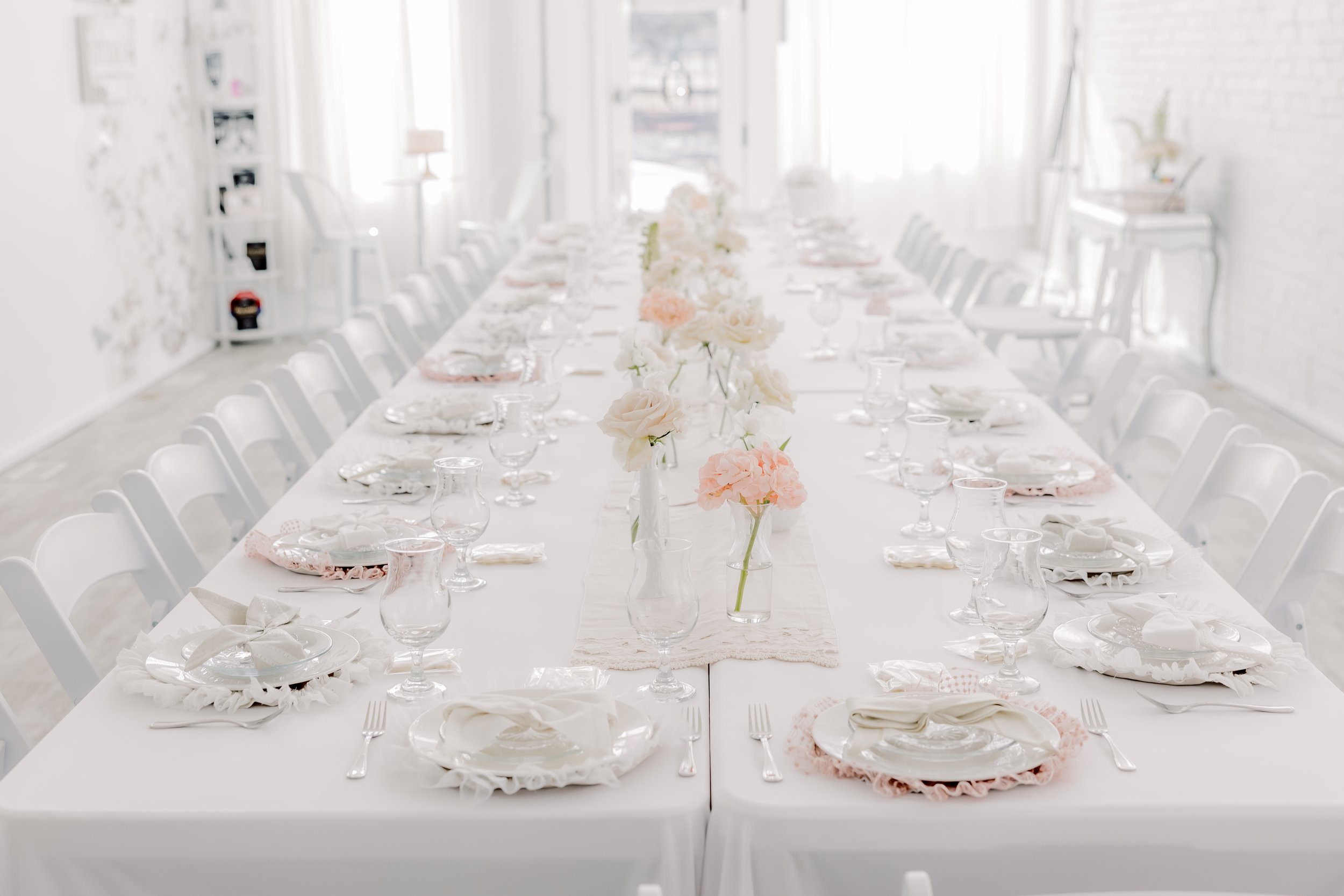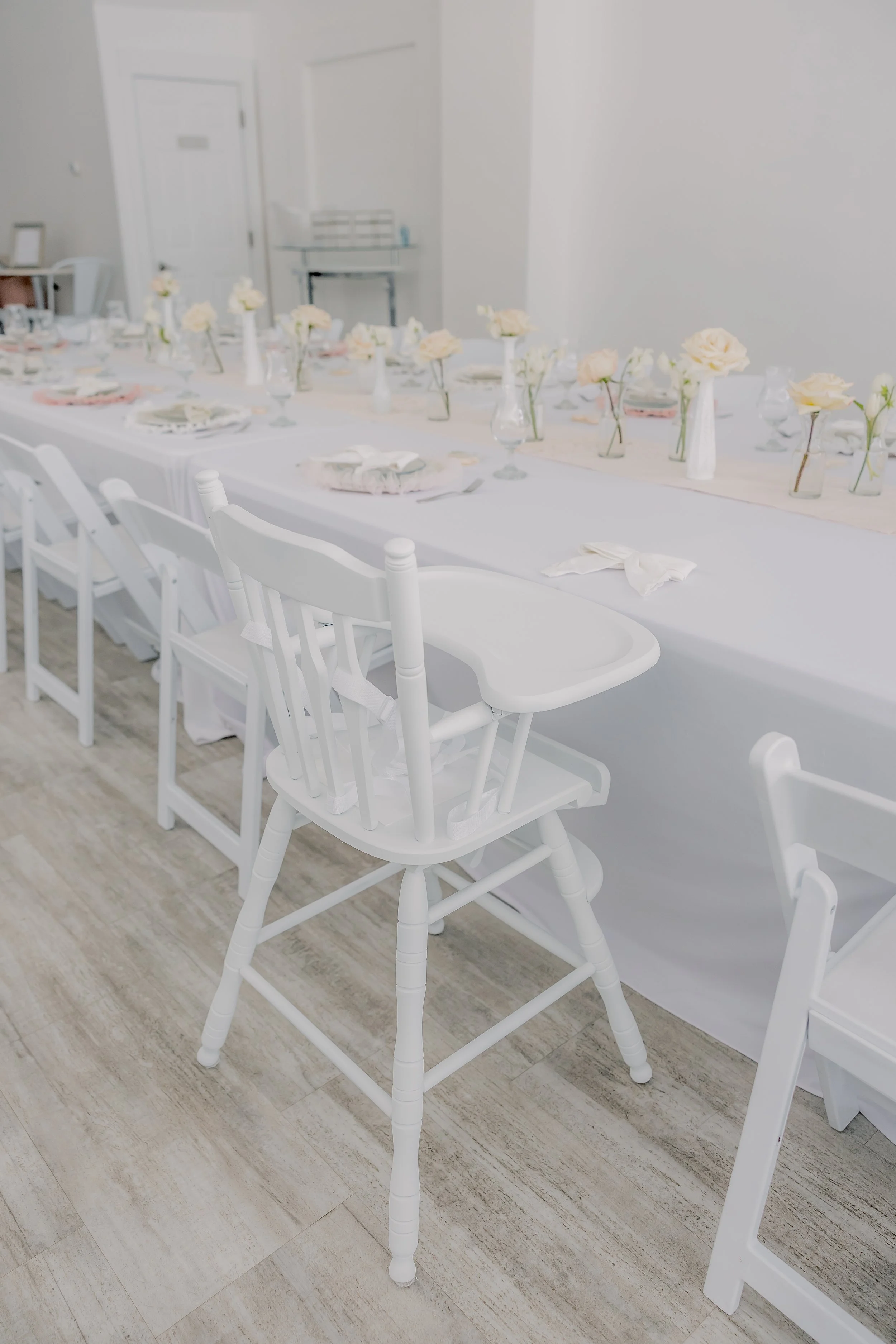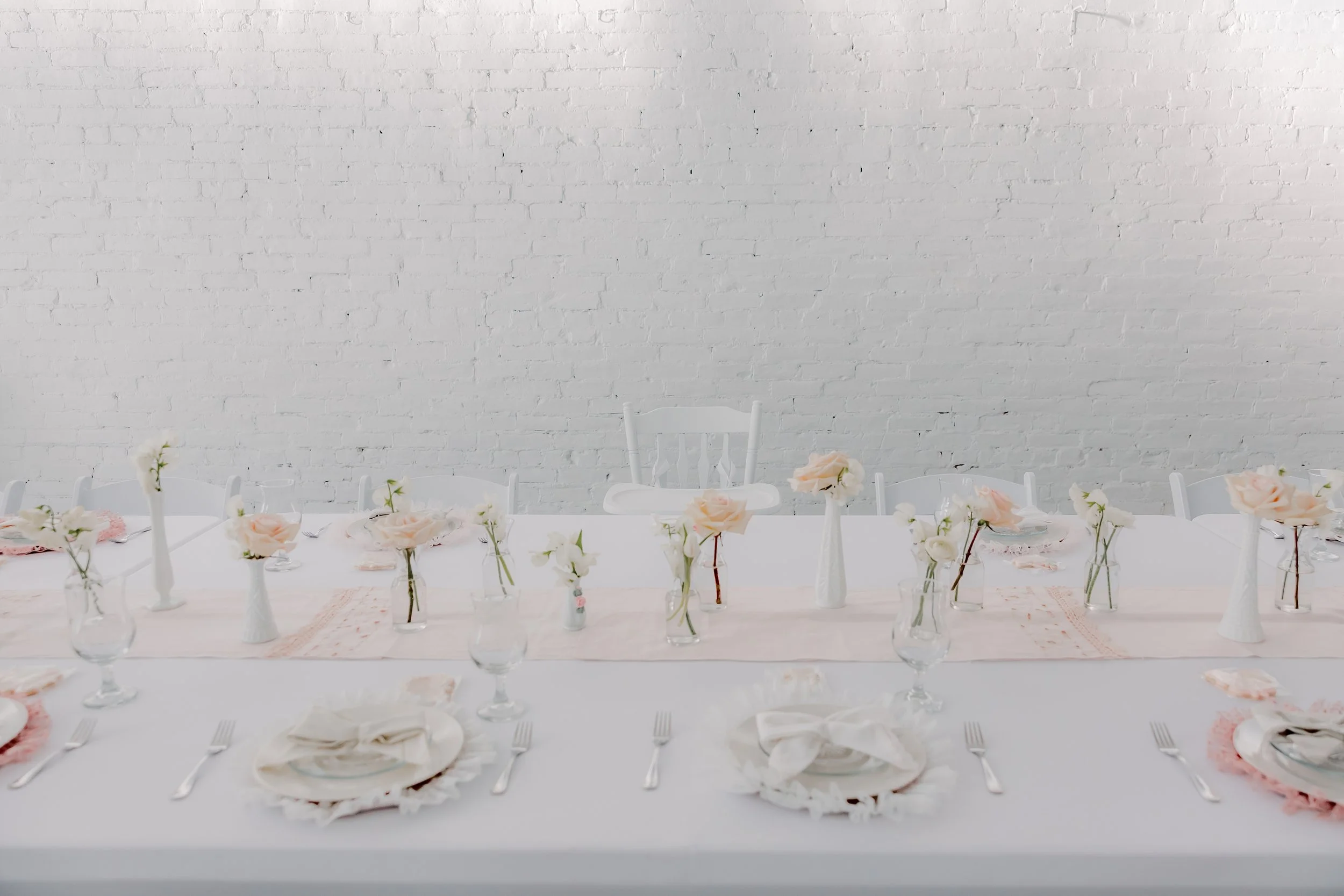 For this “Little Blessing Brunch” theme designed to celebrate a little one’s baptism, our designers used hand-sewn place setting mats made especially for this event, vintage linens and milk glass vases sourced by the team, and a long table filled with fresh florals to create a look that felt sweet, simple, and special.