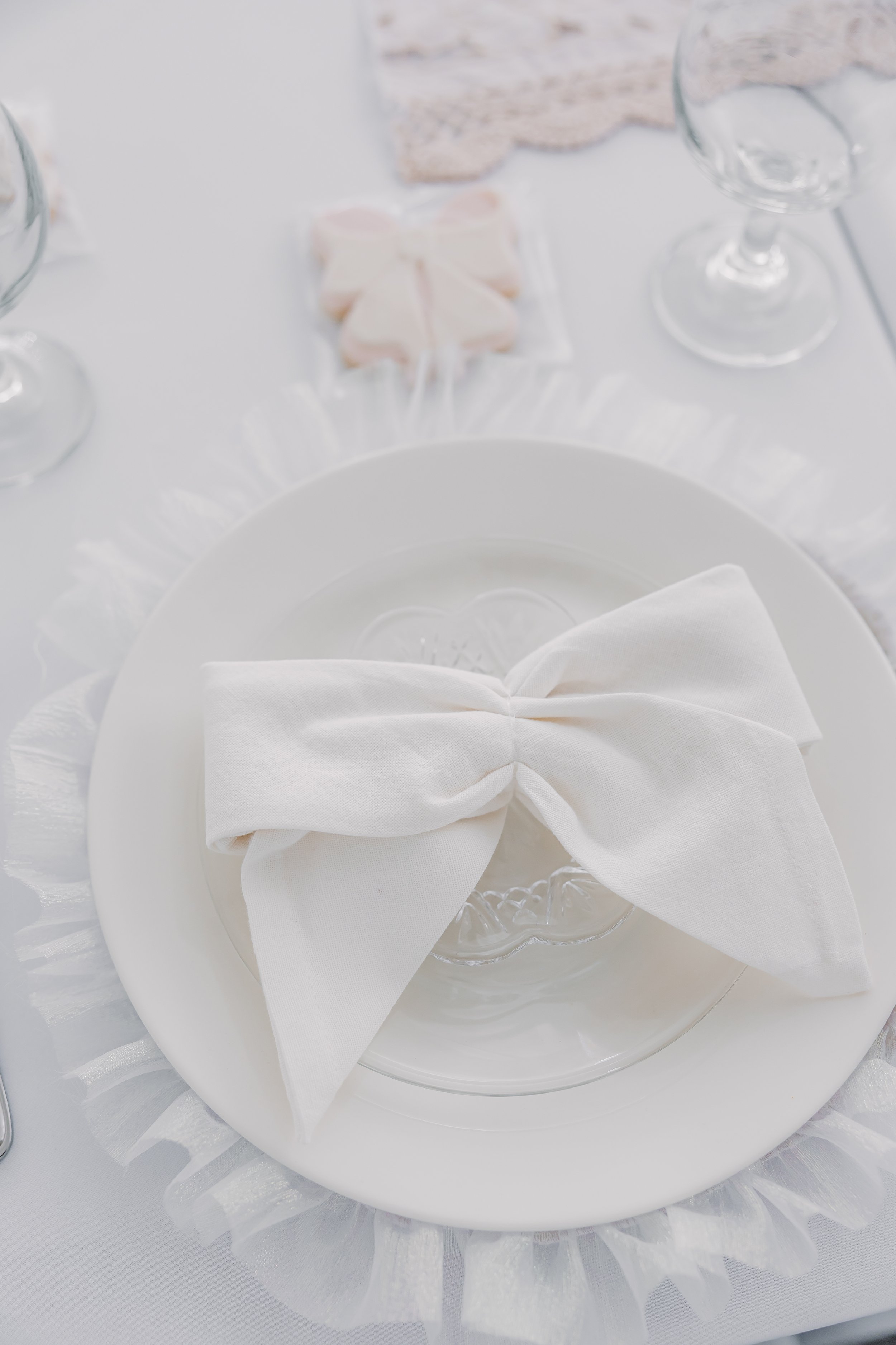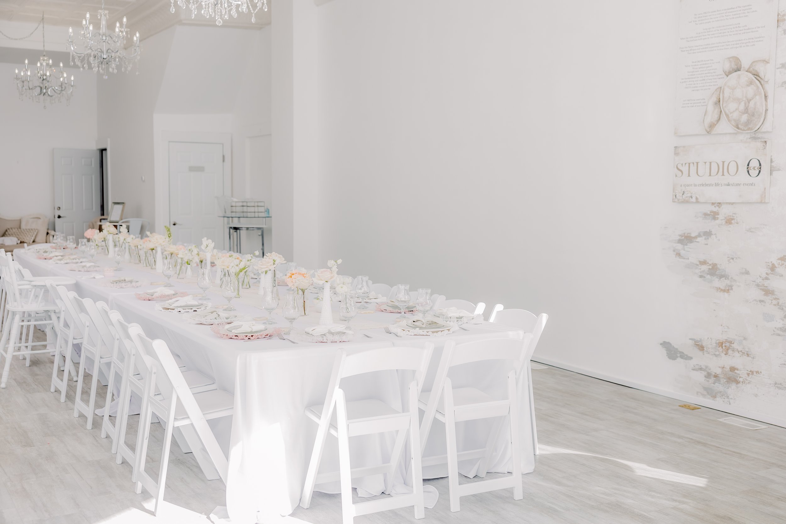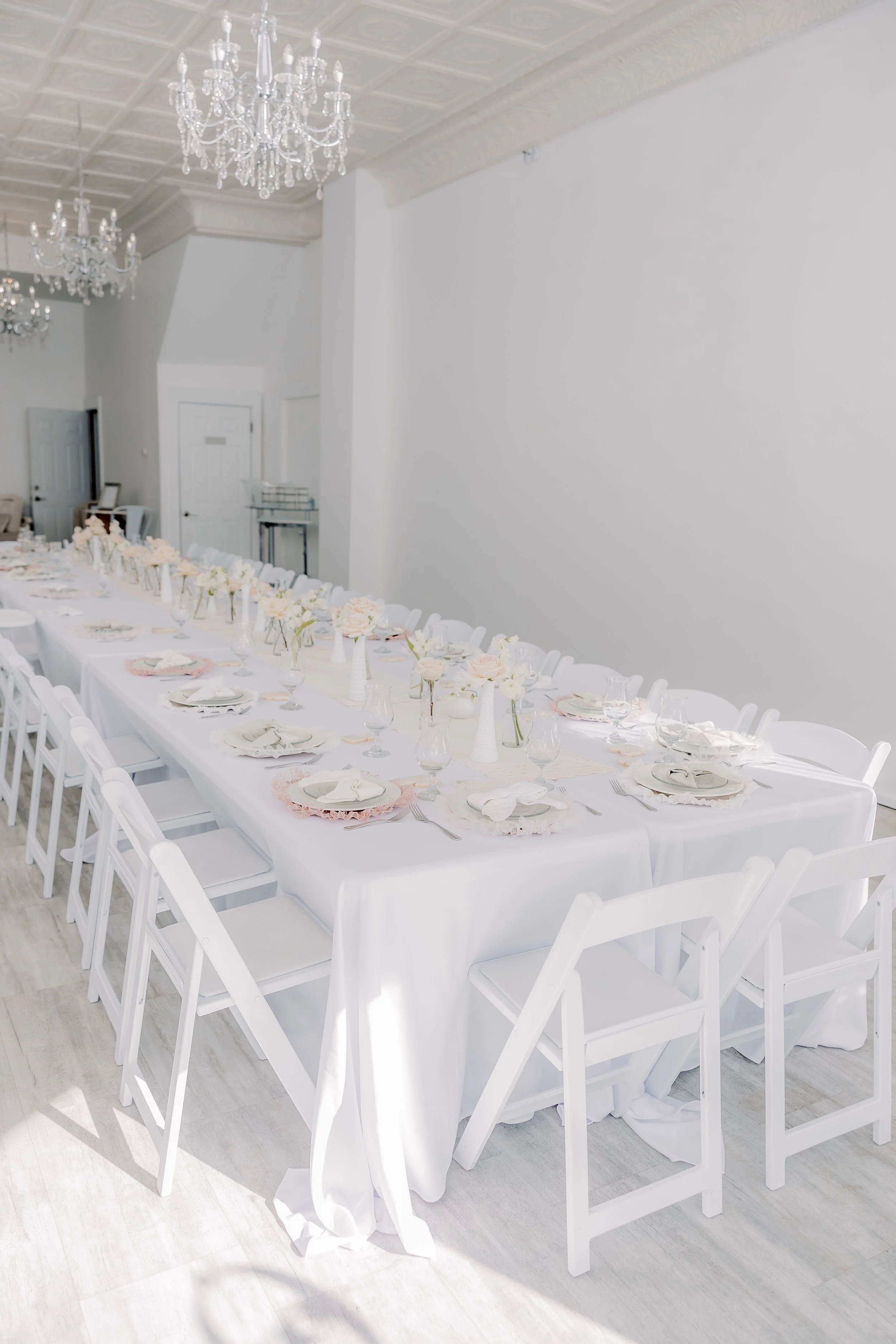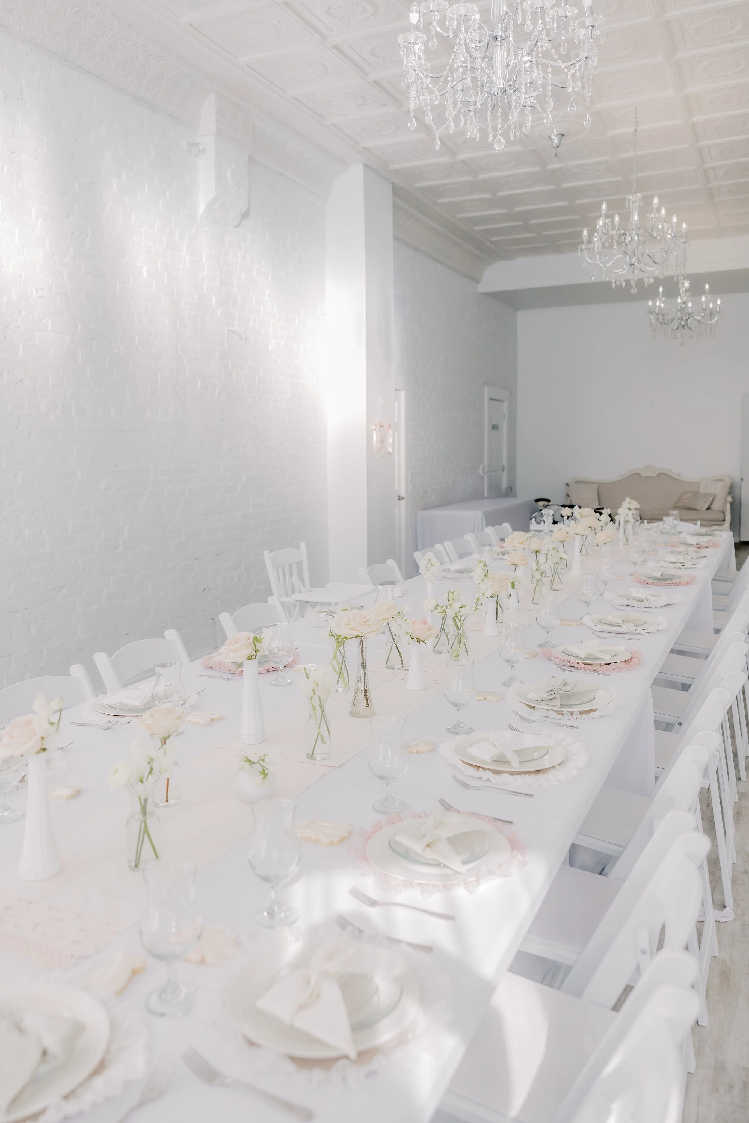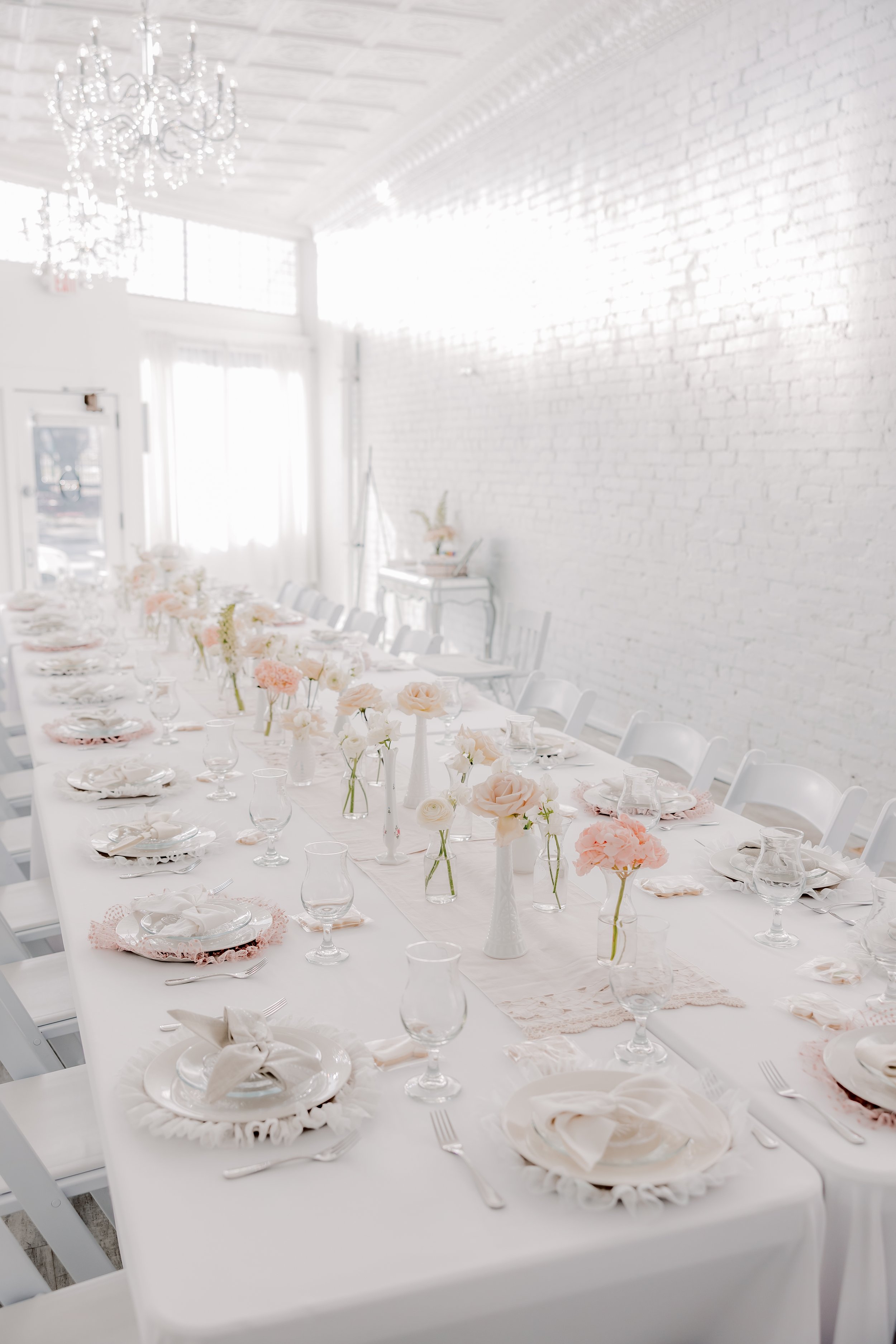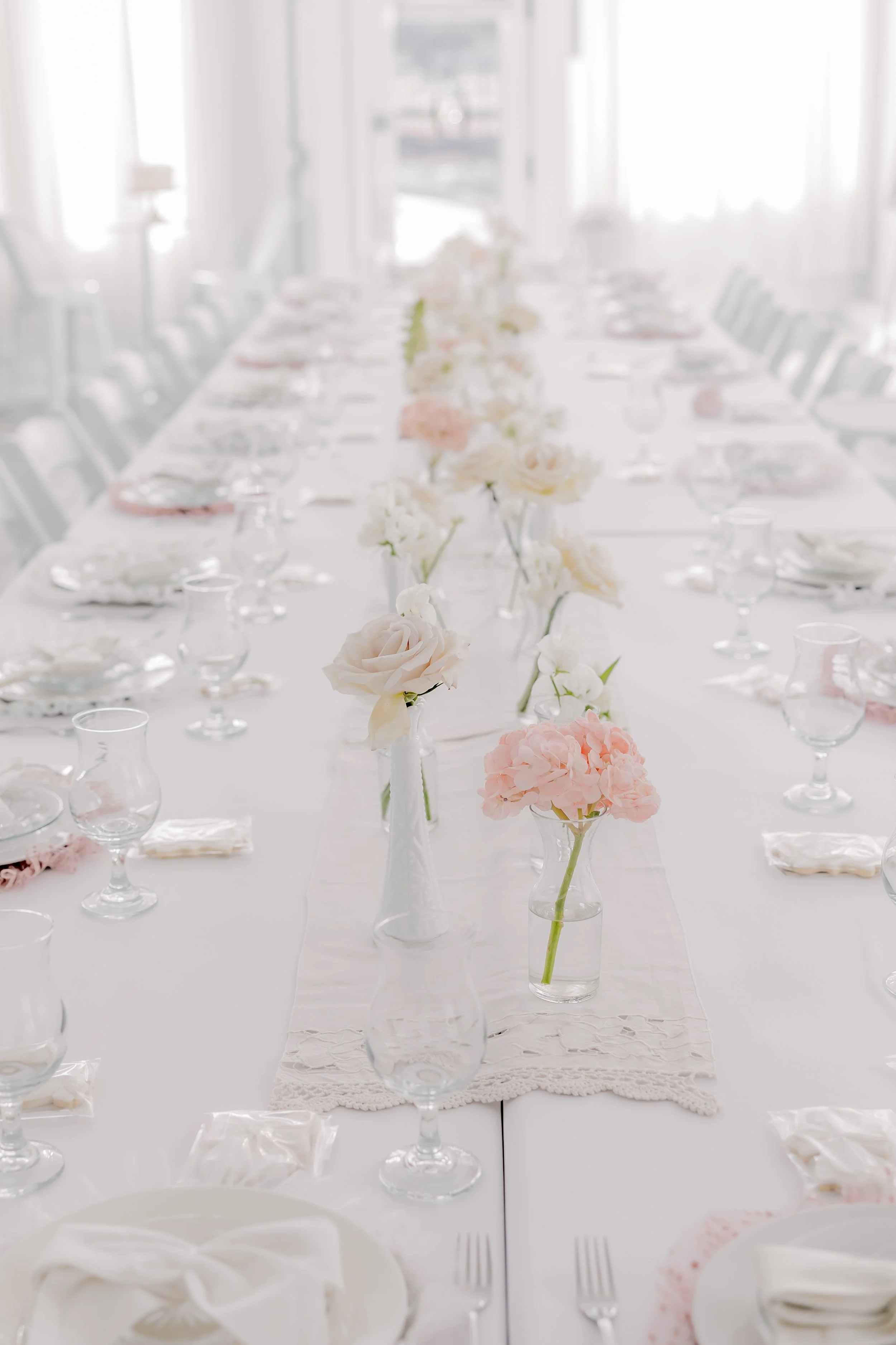 For this “Little Blessing Brunch” theme designed to celebrate a little one’s baptism, our designers used hand-sewn place setting mats made especially for this event, vintage linens and milk glass vases sourced by the team, and a long table filled with fresh florals to create a look that felt sweet, simple, and special.