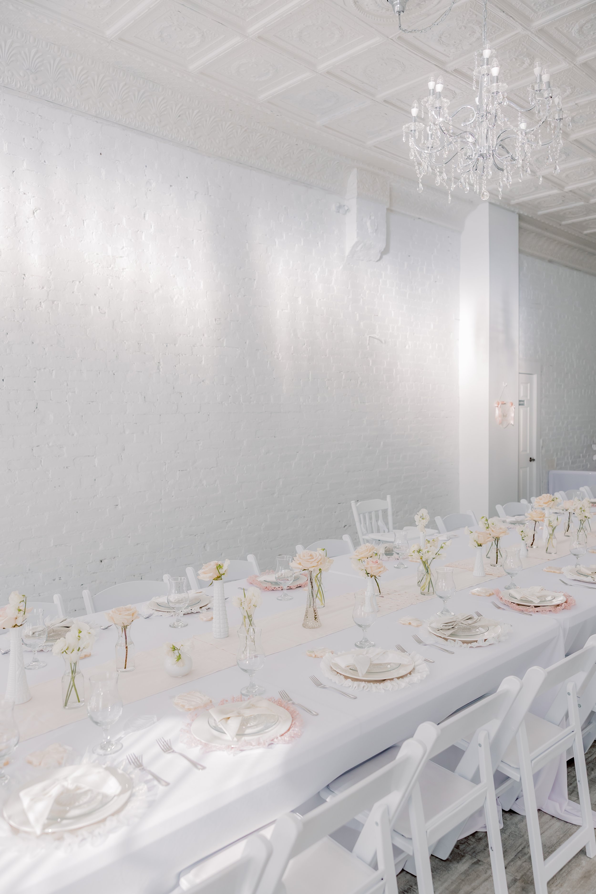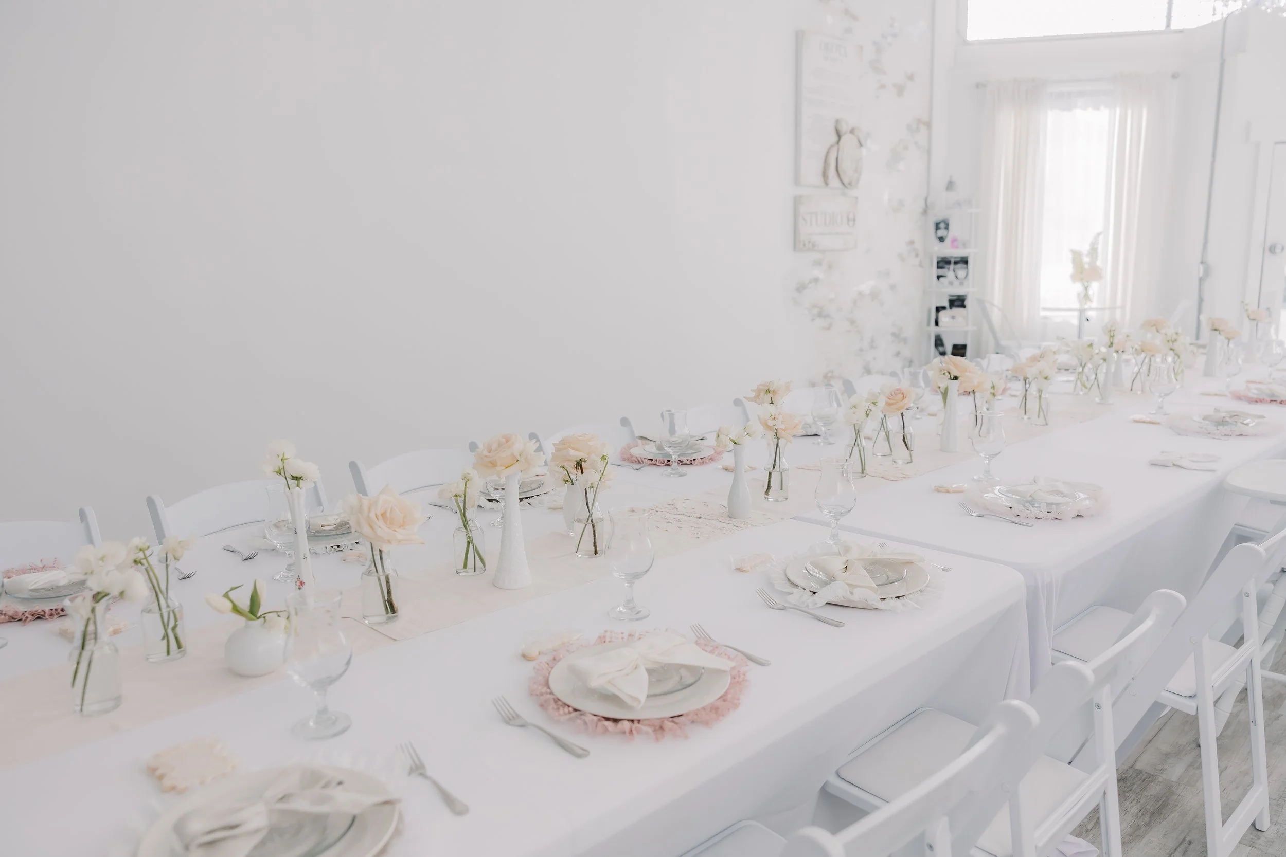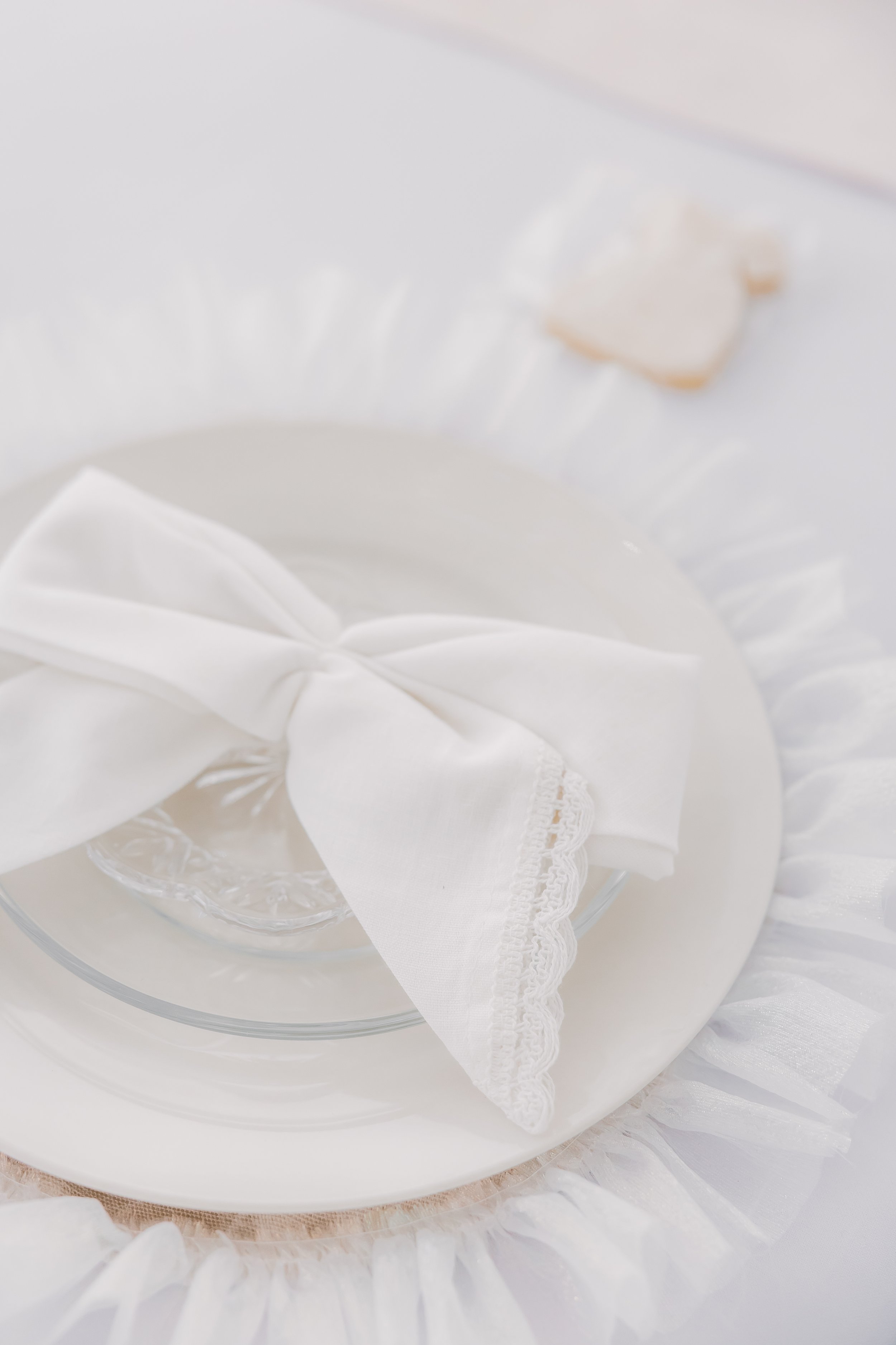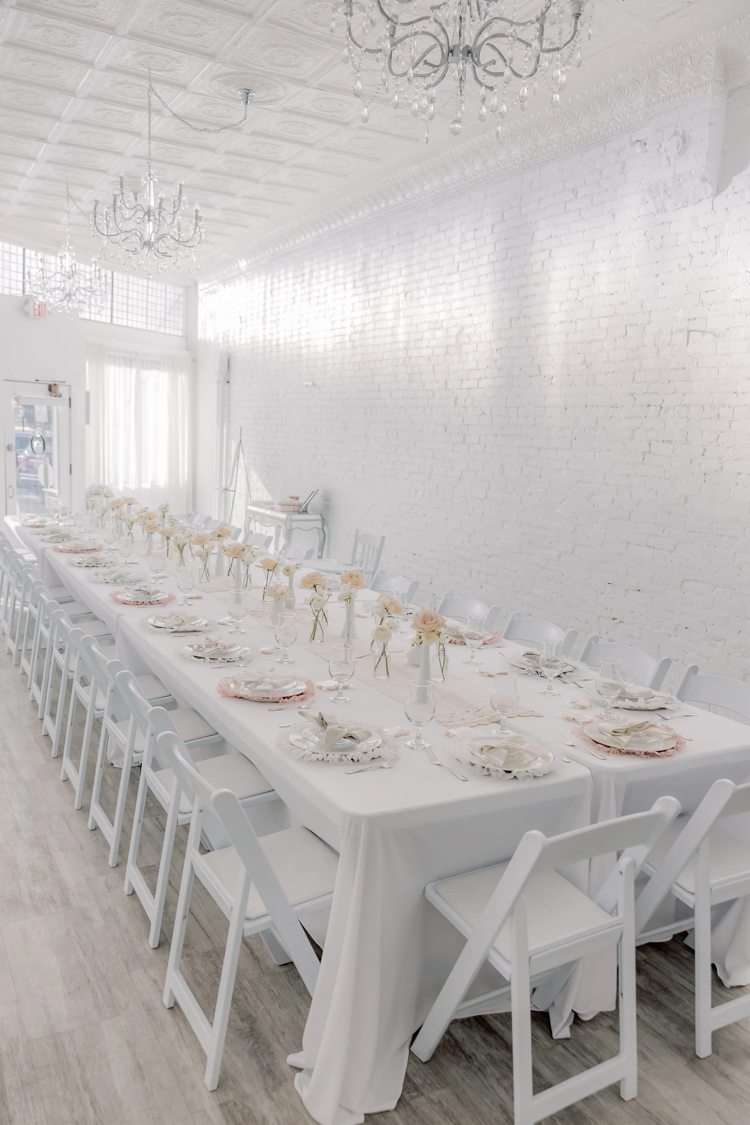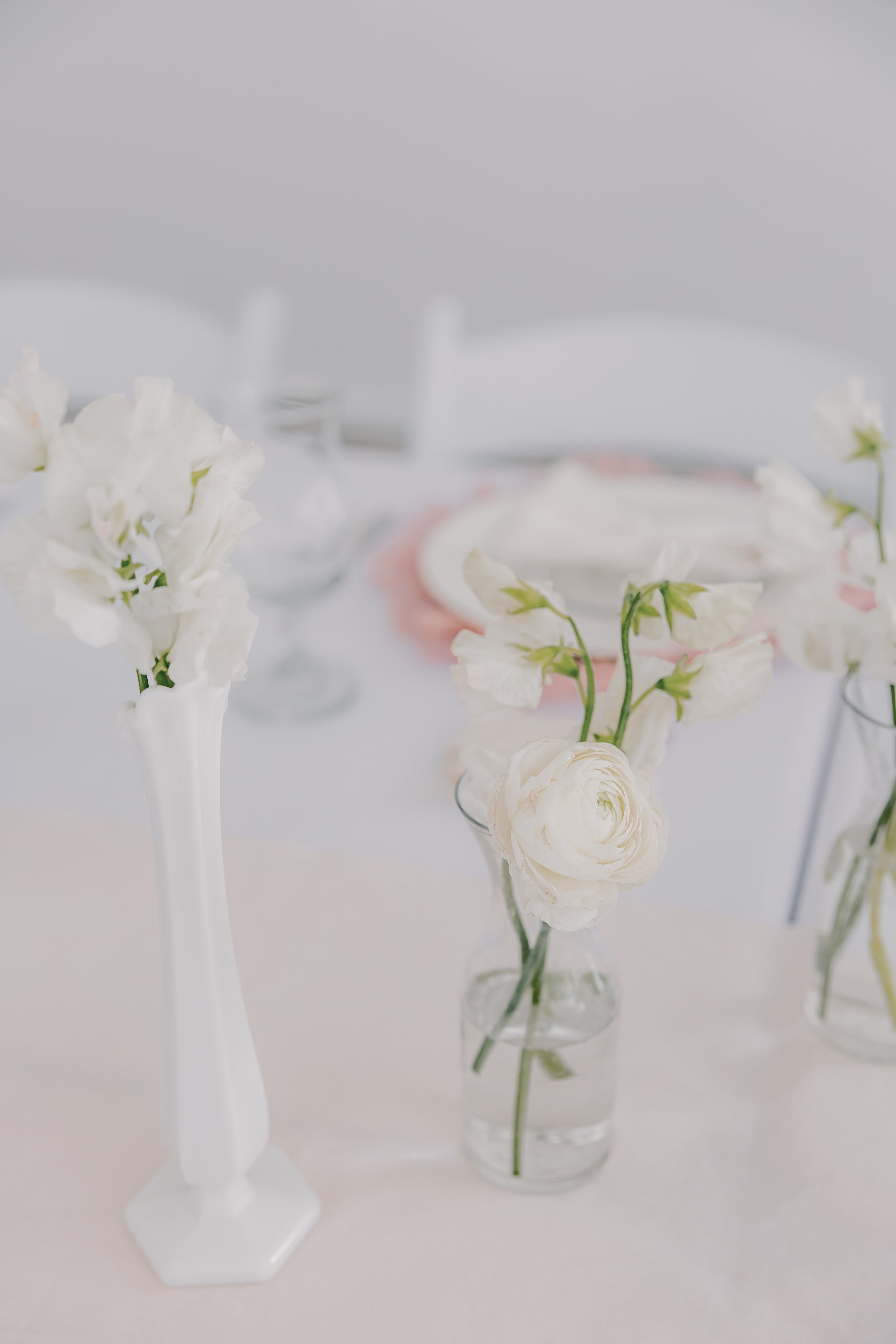 For this “Little Blessing Brunch” theme designed to celebrate a little one’s baptism, our designers used hand-sewn place setting mats made especially for this event, vintage linens and milk glass vases sourced by the team, and a long table filled with fresh florals to create a look that felt sweet, simple, and special.