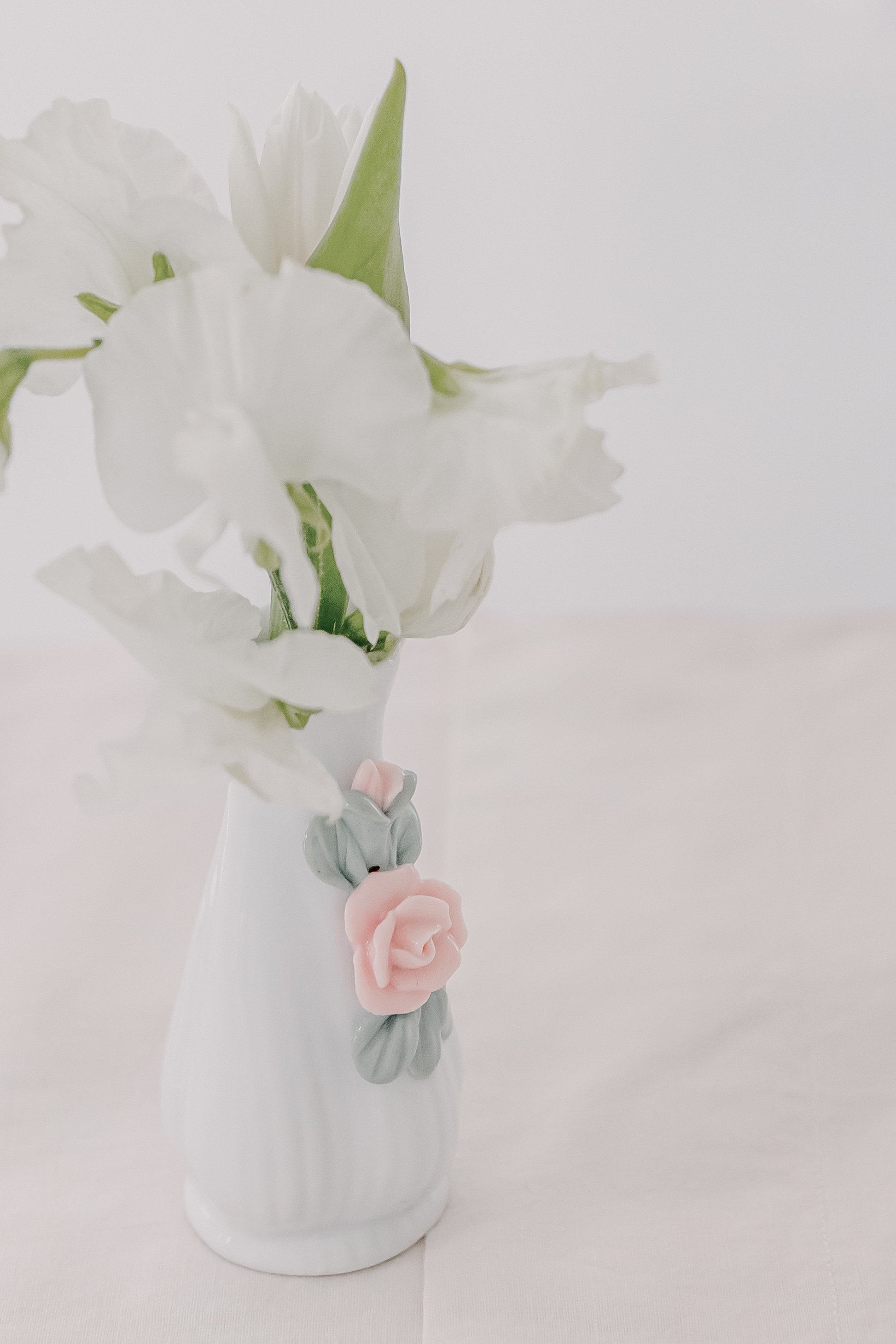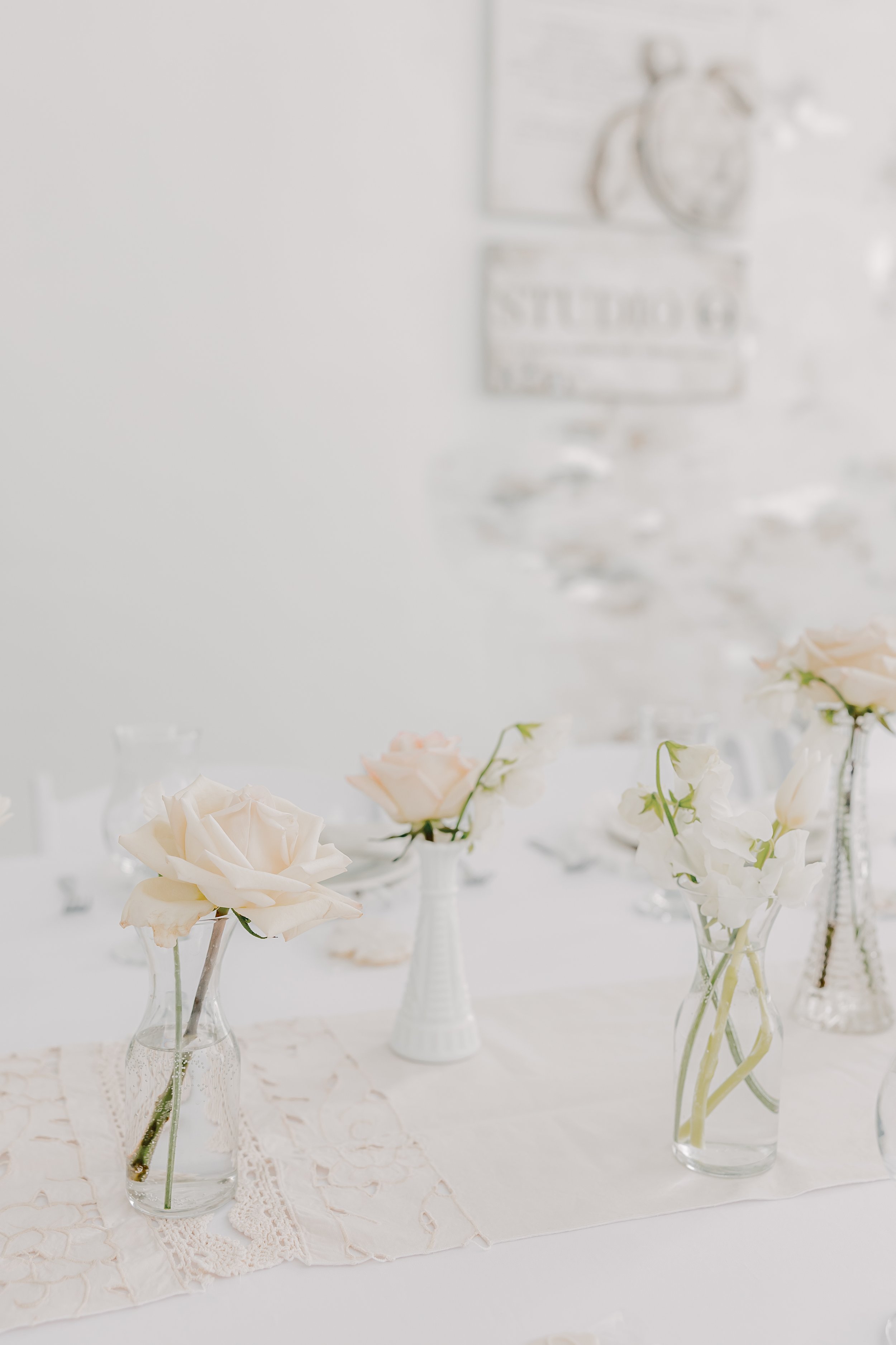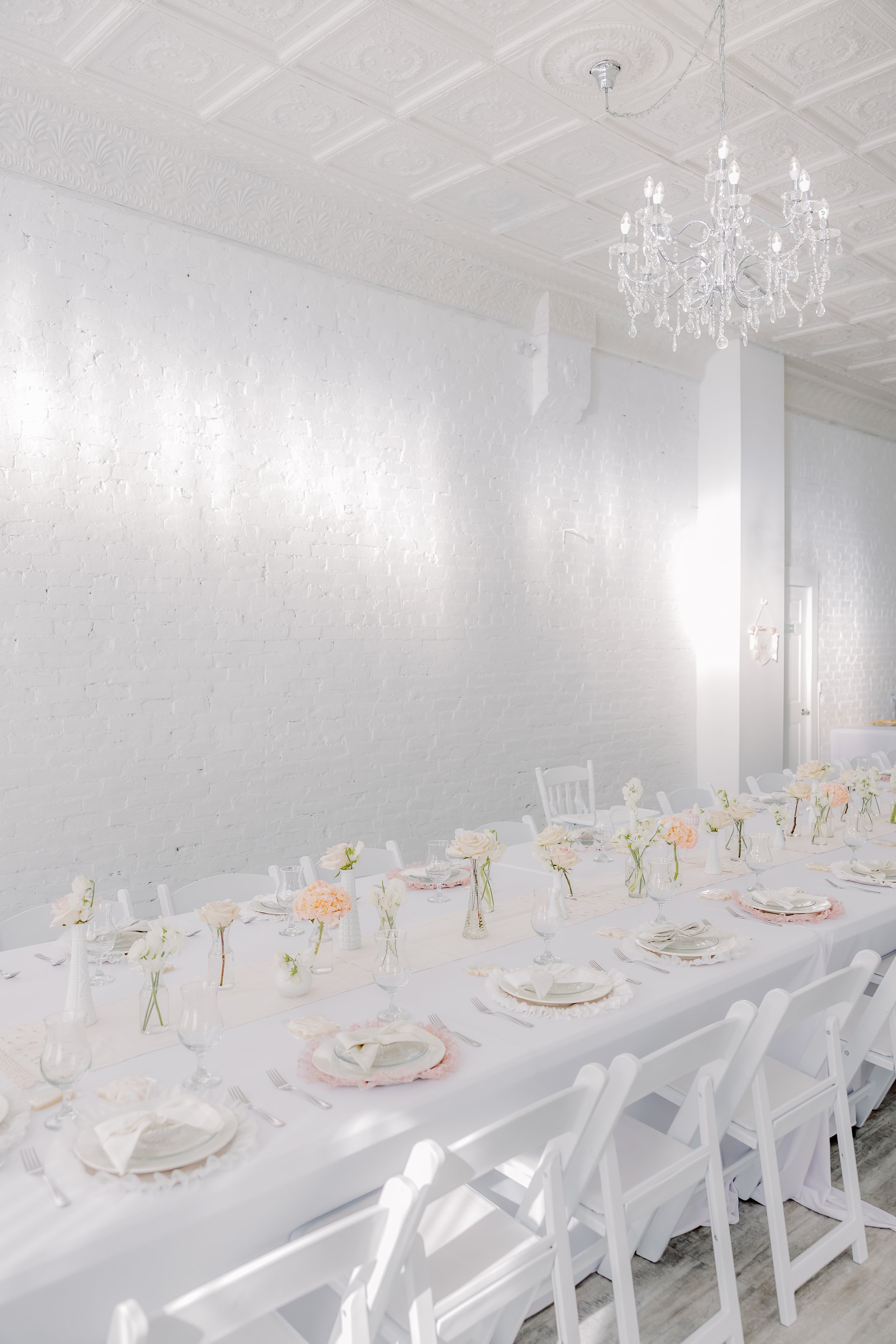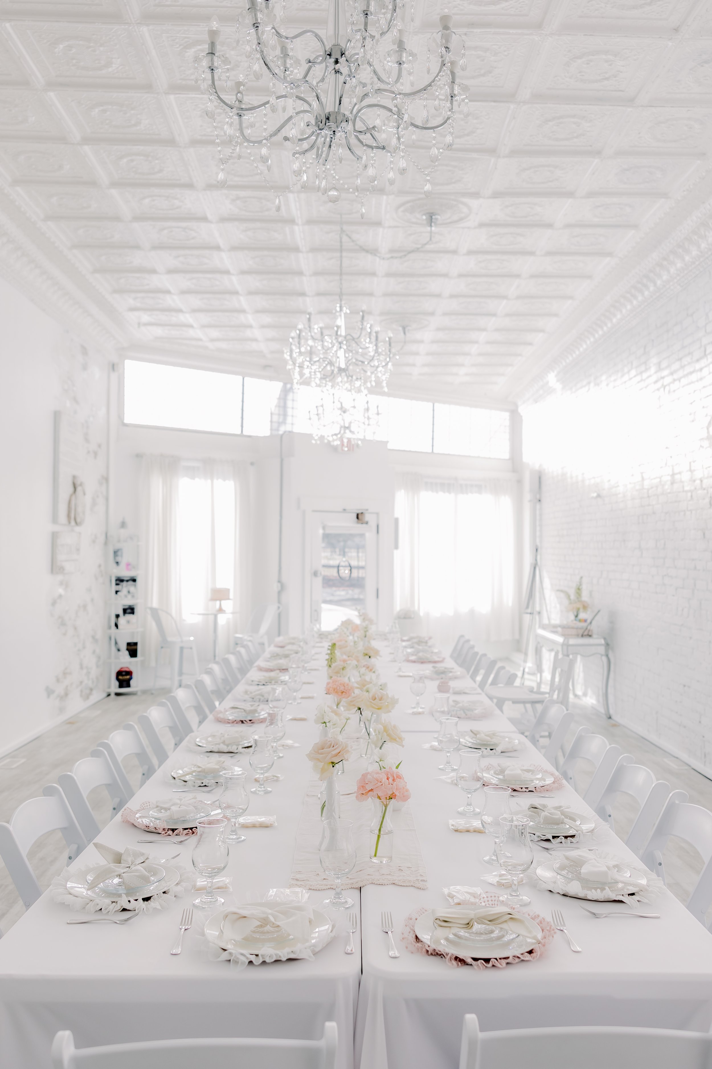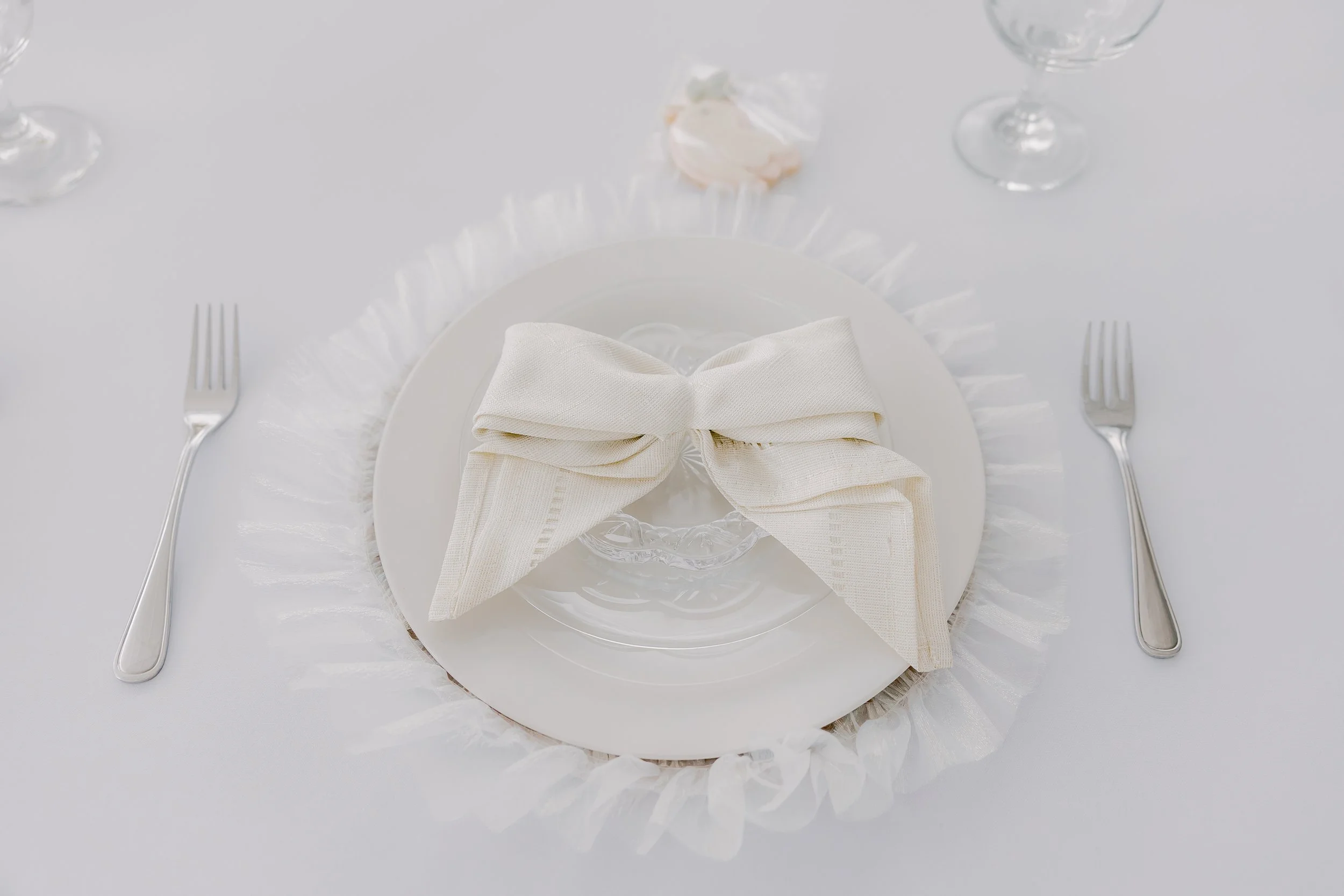 For this “Little Blessing Brunch” theme designed to celebrate a little one’s baptism, our designers used hand-sewn place setting mats made especially for this event, vintage linens and milk glass vases sourced by the team, and a long table filled with fresh florals to create a look that felt sweet, simple, and special.